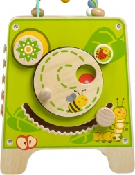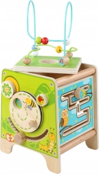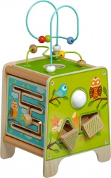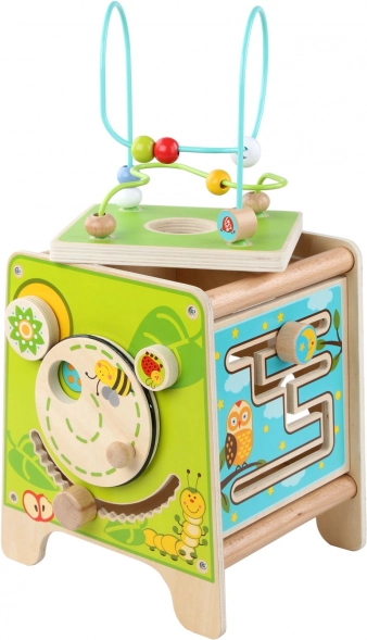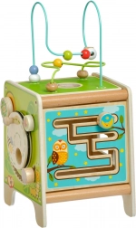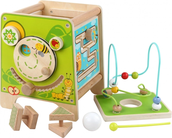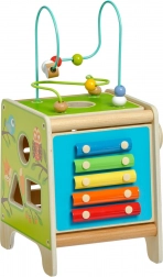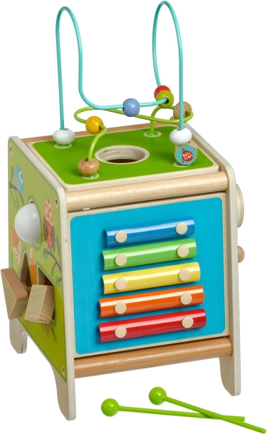 Ez a színes fa aktivitáskocka órákig tartó, értelmes játékot kínál. A felső gyöngylabirintus kivehető és befelé fordítható a kockába az egyszerű tárolás érdekében. Az oldallapokon a gyerekek xilofont ütőkkel, kétrészes forgó geometriai formák formabedobóját, motoros labirintust, forgó kereket, forgó elemeket és egy szórakoztató játékot találnak, ahol egy kis pálcikát kell vájatban tologatni.