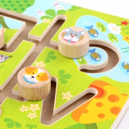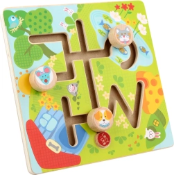 A Napos völgy fa labirintus felfedezésre és tanulásra hívja a gyerekeket. Az illusztrált játéktábla tóval és zölddel bevonja őket a játékba, ahol a kutya, a macska és az egér a saját céljaik felé haladnak. A gördülékeny vájatoknak köszönhetően a figurák könnyen mozgathatók, így a játék biztonságos és intuitív.