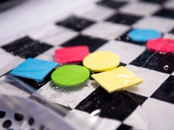 A szőnyeg vízzel van feltöltve, és színes formákat tartalmaz, amelyek érintéskor mozognak, és elősegítik a tapintásos fejlődést.