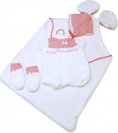 A csomag tartalma egy 3 részes szett és egy dekoratív, füles alátét a még nagyobb mókáért a babáról való gondoskodás során. Műanyag tasakban, műanyag vagy karton vállfával csomagolva – könnyen tárolható és ajándékozható.