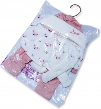 A négyrészes készlet sapkát, ruhát, nadrágot és zoknit tartalmaz összehangolt színekben, így a baba mindig csinosan összeillő és melegen öltözött lesz.