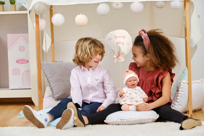 Stílusos, 4 részes ruhaszett NEW BORN babákhoz 40–42 cm méretben, finom pasztellszínekkel, meleg anyagokkal és egy aranyos, „hug me” feliratú ballon alakú ölelő plüssel. Tökéletes a kényelmes átöltöztetéshez, a valósághű gondoskodó szerepjátékhoz és ajándéknak babarajongó gyerekeknek. Spanyolországban készült, 3 éves kortól ajánlott.