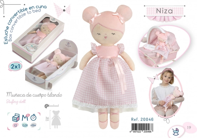 A bájos, rózsaszín kivitelű Niza plüss baba minden kis balerinának örömet szerez. Pehelykönnyű, selymes tapintású, és ideális ölelgetéshez és utazáshoz. A csomag része egy praktikus, 2 az 1-ben doboz, amely bölcsővé alakítható, így a gyermek azonnal játszhat. A baba 30 °C-on mosható, és minőségi kidolgozásával valamint finom spanyol dizájnjával tűnik ki.