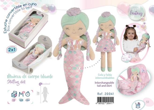 Az Óceán Fantázia plüss baba a 2021-es kollekcióból minden kislányt elbűvöl gyönyörű spanyol dizájnjával. Egy olyan anyagból készült huzat tartozik hozzá, amely sellő farokként szolgál, ezáltal lehetővé téve az átalakulást kislánnyá. Ez a multifunkcionális készlet tartalmaz egy díszdobozt is, amelyet át lehet alakítani bölcsővé.