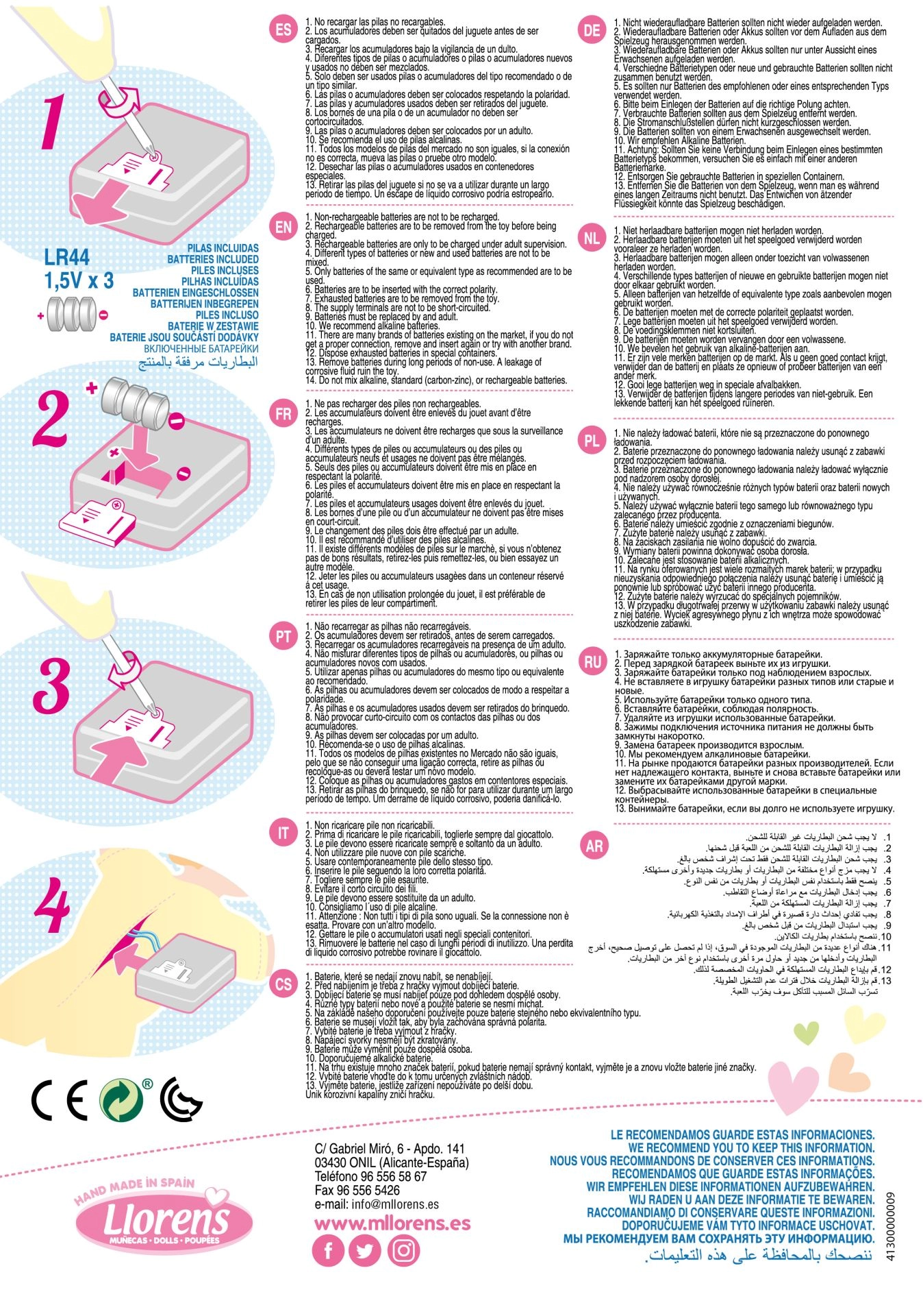 A baba Spanyolországban, kézi gyártással készül, nagy hangsúlyt fektetve a minőségre és a részletekre. Elegáns ajándékdobozba csomagolva érkezik, így kiváló ajándék. A babához külön megvásárolható az eredeti, 33 cm-es mérethez készült Llorens ruházat. Az elemek a csomag részét képezik, így a biztosíték eltávolítása után azonnal játékra kész.