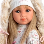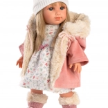 A részletekre és a minőségre koncentrálva, Elena baba rózsaszín kabátban szőrmegallérral és fehér virágmintás ruhában van öltöztetve.