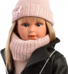 Carla modern összeállítást visel: fekete „biker” műbőr kabátkát, sötét szoknyát rókás mintával, rózsaszín kötött sapkát pomponnal, nyakmelegítőt, zoknikat és cipőket. Nem hiányzik a kicsi kötött kézitáska sem. Az EU biztonsági szabványainak köszönhetően a baba teljesen biztonságos. Díszdobozban szállítva – tökéletes ajándék.