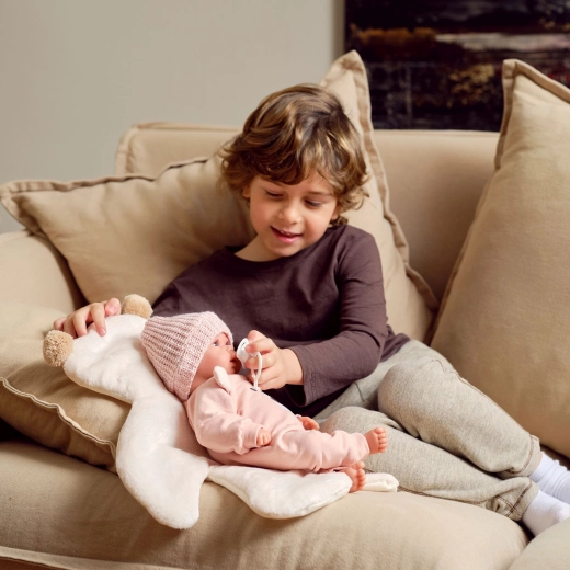 A Llorens New Born élethű baba gyengéd gondoskodást és az utánzó játék örömét nyújtja a gyerekeknek. A puha textil test kellemesen ölelhető, az élethű arcrészletek és a hangok autentikussá teszik a játékot. A mellkas megnyomására a baba azt mondja: „mama”, „papa”, és sír, ami segíti az empátia és a gondoskodó készségek fejlődését.