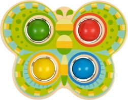 Színes pillangó négy golyó számára kialakított nyílásokkal (zöld, piros, sárga, kék), amely segíti a színek felismerését és fenntartja a figyelmet.