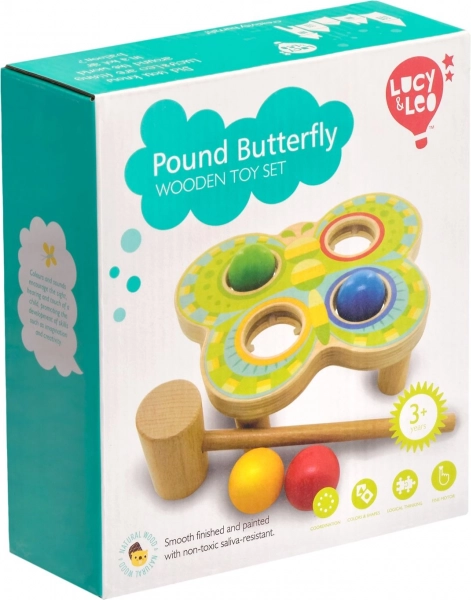 Ez a minőségi, fa kalapálós játék pillangó formában vidám színeivel és okos játékelvével nyeri el a gyerekek tetszését. A gyermek a kalapáccsal gyengéden a színes golyókra üt, amelyek azonos színű nyílásokba esnek, így gyakorolja a koordinációt és a színfelismerést.
