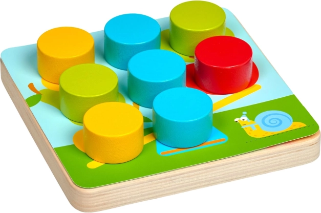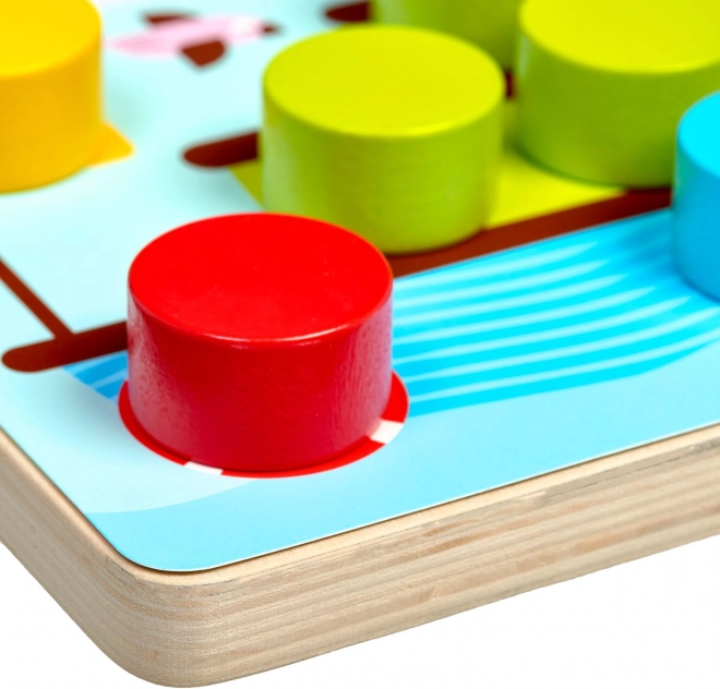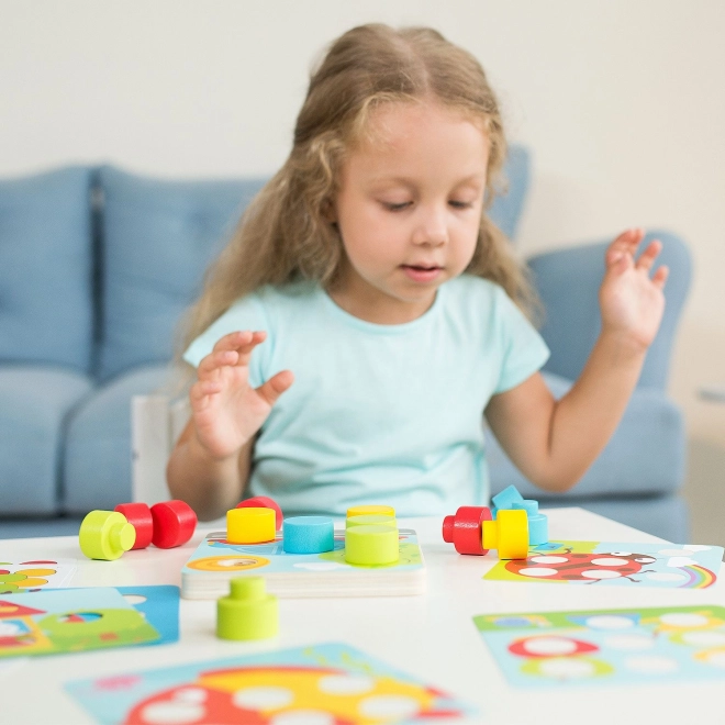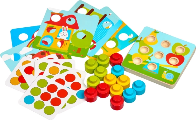 A nagy fa tüskék könnyen megfoghatók és a lyukakba illeszthetők, ami támogatja a szem–kéz koordinációt és a színek játékos tanulását.