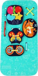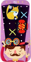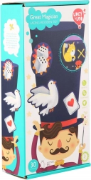 Ez a szórakoztató fűző és átfűzős készlet bűvész témával a képzelet világába hívja a gyerekeket. A nagy alaplapra, amelyen a bűvész feje és kalapja látható, a zsinórok segítségével színes kiegészítőket rögzíthetnek – a nyuszitól és érméktől a titokzatos kártyákig. Játék közben a gyerekek gyakorolják a szem–kéz koordinációt, a türelmet és az alkotókészséget.