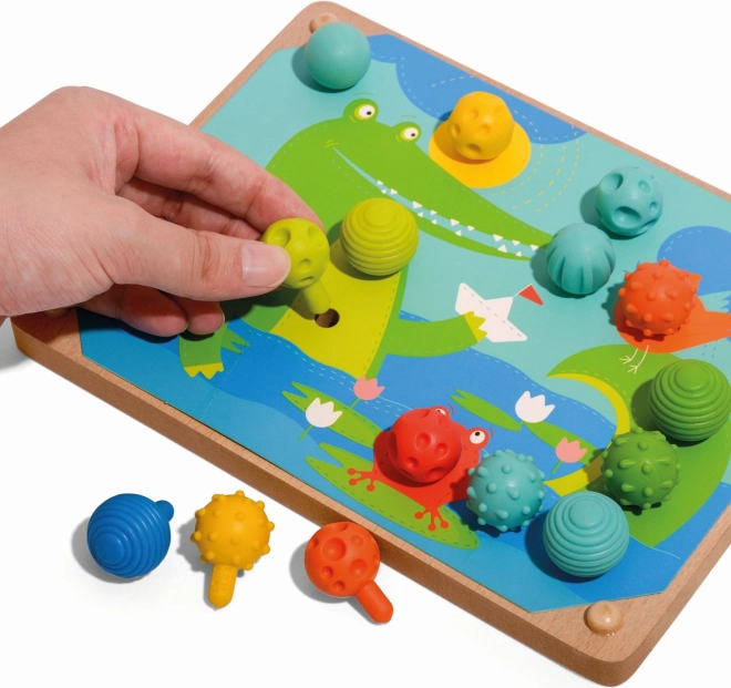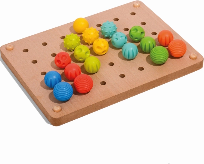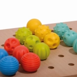 A szett 35 csapot tartalmaz eltérő felületi struktúrákkal, ideális a gyerekek szenzoros fejlődéséhez.