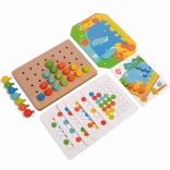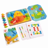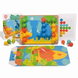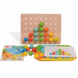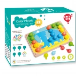 A mozaik és fűzés remek eszköz a kisgyermekek számára a finommotorikus készségek és a kreativitás fejlesztéséhez. 35 nagy, hét élénk színben elérhető szilikon csapot tartalmaz, amelyekkel a gyerekek kitölthetik a színes előlapokat. A szett 12 színes állatos képet és 6 kétoldalas sablont is tartalmaz.