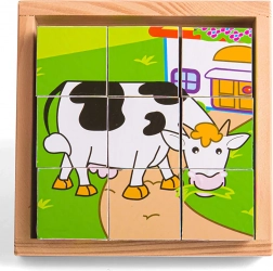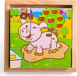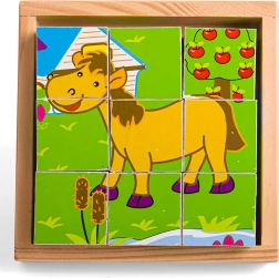 Kilenc masszív fa kocka együtt hat cuki állatos képet alkot. A gyerekek a kockákat forgathatják, kombinálhatják és alkothatnak, ami természetes módon fejleszti a finommotorikát, a kézügyességet és a koncentrációt. A készlethez tartozik egy fa alaplap is a könnyű kirakáshoz és biztonságos tároláshoz – ideális otthonra és útra.