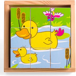 Az Állatos képes kockák játékos formában kínálnak felfedezést a gyerekeknek. A kilenc minőségi fa kocka hat különböző motívumot állít össze, amelyek támogatják a vizuális észlelést és a logikus gondolkodást. A masszív kivitelnek köszönhetően a kockák a legkisebb kezekben is jól tarthatók.