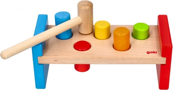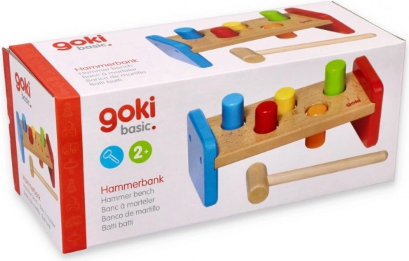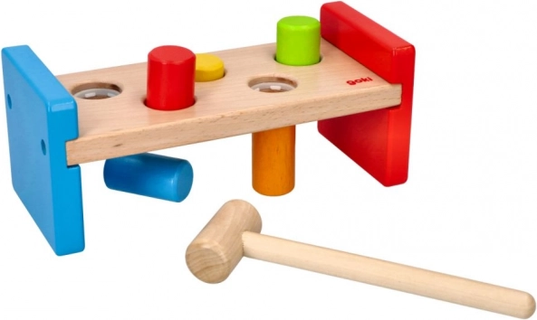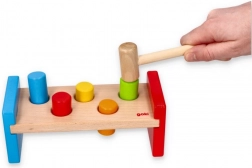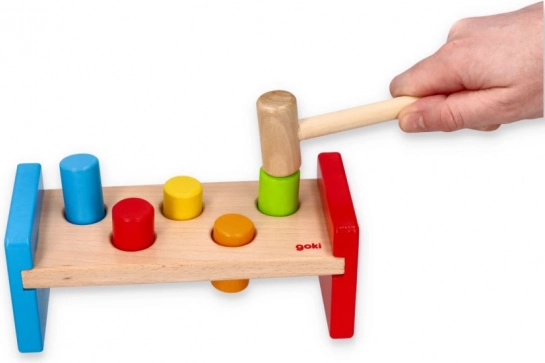 Ez a masszív kalapálós pad tartós, simára megmunkált fából készül, biztonságos, nem mérgező festékekkel. A gyerekek a fa kalapáccsal gyakorolhatják a fogást, az ütés erejét és a türelmet, miközben a színes peckek újra és újra játékra csábítanak.