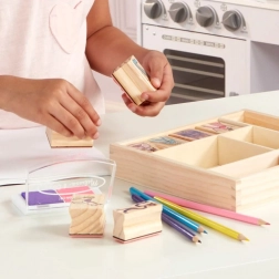 A bélyegzők és ceruzák elegánsan tárolhatók a fa doboz rekeszeiben, így könnyű megszervezni és szállítani őket.