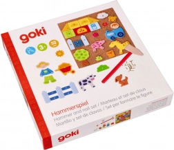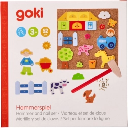 Ez az eredeti Goki Kalapácsos Játék órákra nyújt szórakozást és alkotást a gyerekeknek. A készlet összesen 52 elemet tartalmaz – fa formákat, szegeket, parafa alátétet és kalapácsot, amelyek lehetővé teszik különböző képek készítését állatokkal, farmmal és más motívumokkal.