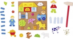 A játék támogatja a finommotorikus képességeket és a kreativitást a 3 éves kortól. A gyerekek a kalapács és a szegek segítségével egyszerűen rögzíthetik a fa formákat a parafa táblára, majd újra szétszedhetik, így mindig új kreatív kalandok elé nézhetnek.