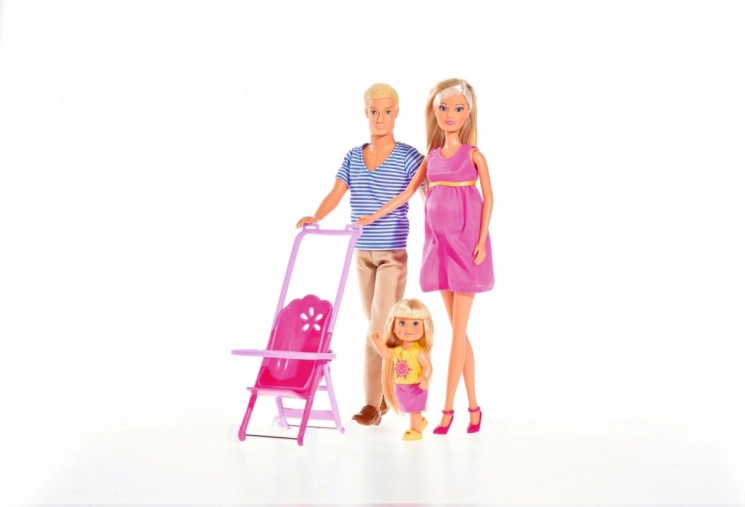A Steffi Happy Family készlet 3 babát tartalmaz: a várandós Steffit, Kevint és a kis Evit babakocsiban.Több mint 19 kiegészítő is a csomag része.