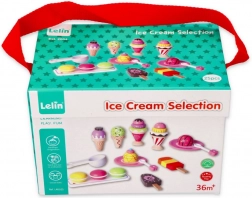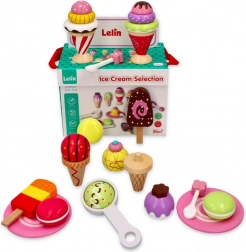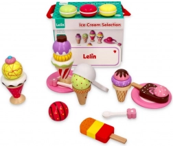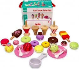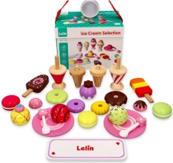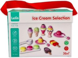 Az elegáns Lelin fagylaltkészlettel minden gyerekből fagylaltárus válhat. Ez a készlet 25 színes darabot tartalmaz és ideális 3 évesnél idősebb gyerekek számára. A játékok lakkozott fából készültek és erős dobozban, kényelmes klappal és fogantyúval vannak csomagolva a könnyű szállításért.