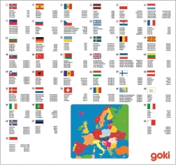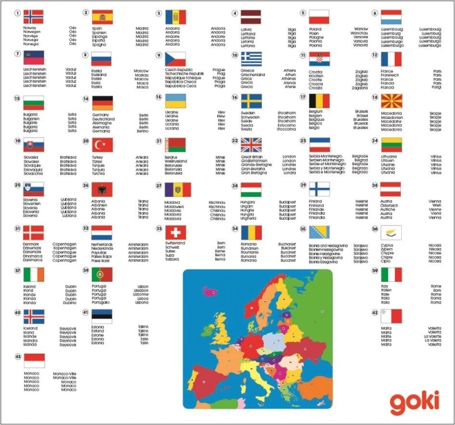A Goki Európa térképe fa puzzle ideális oktatójáték gyerekeknek és iskolásoknak. Az egyes országok alakjára vágott darabok masszív fa alaplapba illeszkednek marással készült nyílásokba, ami megkönnyíti a kezelést és támogatja a helyes elhelyezést. Minden ország számmal van jelölve, a legendában pedig megtalálható a neve, a fővárosa és az állami zászlója.