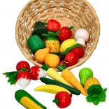 21 darab fából készült gyümölcsöt és zöldséget tartalmaz, ami biztosítja a