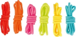 A készlet színes fa gyöngyöket és elegendően hosszú zsinórokat tartalmaz, amely ideális kreatív projektekhez.