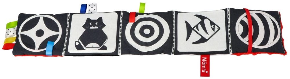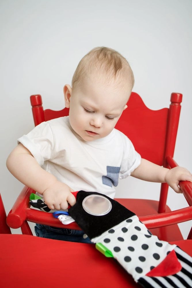 A fekete-fehér motívumok piros akcentusokkal felkeltik az újszülöttek figyelmét, és segítik a látásélesség és a tárgykövetés fejlődését.