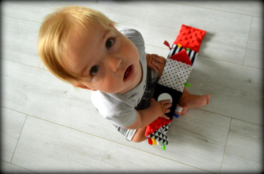 Puha párnázás, minky, frottír, hurkok és zörgő elemek ösztönzik a babát a megfogásra, gyurmázásra és a tapintásos, valamint hallási felfedezésre.