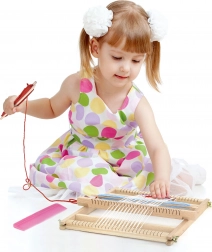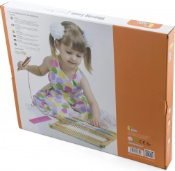 A csomag mindent tartalmaz az azonnali kezdéshez: előre felfeszített fehér láncfonal és két színes gombolyag (kék és piros) a vetélőkön. A speciális emelőlécezés felváltva megemeli a láncfonalakat, így a fonal átfűzése gyors és áttekinthető. Esztétikus, színes csomagolása remek oktató ajándék kis alkotóknak.