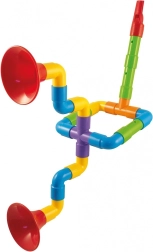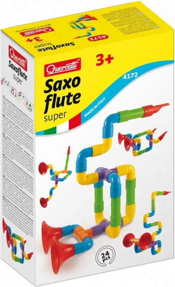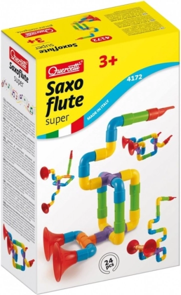 A Quercetti Saxoflute Super építőjátékkal a gyerekek saját hangszerüket építhetik meg, mint például szaxofonokat, fuvolákat, és trombitákat, színes műanyag csövekből és csatlakozókból. A készlet 24 részből áll, ami különféle kombinációkat és formákat tesz lehetővé. Ezáltal a játék nemcsak a kreatív gondolkodást, hanem a finommotorikus képességeket és a képzelőerőt is fejleszti.