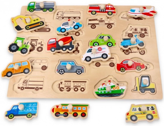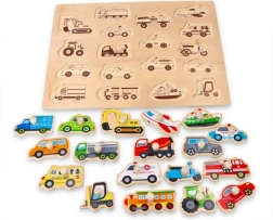 Ez a minőségi, természetes fából készült beillesztős kirakó biztonságos és lebilincselő játékot kínál a gyerekeknek. Minden elem egy-egy különböző járművet ábrázol, és praktikus, fából készült gombos fogantyúval rendelkezik a kis kezek számára is könnyű megfogáshoz. Az alaplapon nyomtatott körvonalak segítik a helyes elhelyezést, és tanítják a formák és színek felismerését.