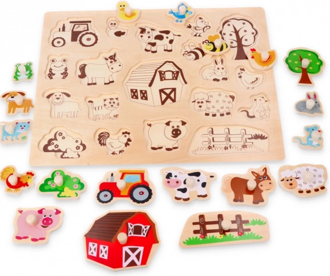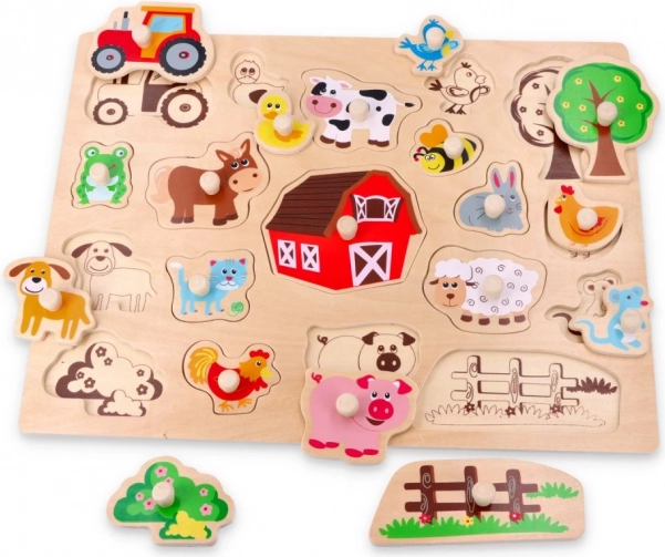 Ez a masszív fa formaberakó bevezeti a gyerekeket a farm világába. A színes, lakkozott elemek jól látható körvonalakkal könnyedén illeszkednek a természetes fából készült alapba. Minden elem a fogantyúnak köszönhetően a kis kezek számára is jól megfogható, ami támogatja a finommotorika és a türelem fejlődését.