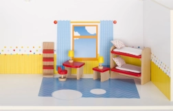 Az emeletes ágy párnákkal, az asztal, a székek és a lámpácskák támogatják a képzeletbeli történeteket és a gyermeki fantázia fejlődését.
