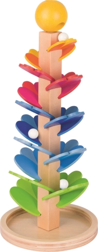 A GOKI márka minőségi fa spirálja torony formájú, kaszkádszerűen elhelyezett, különböző színű, kivágott levelekkel. A gyermek a csúcs nyílásába helyezi a golyót, majd figyeli, ahogy fokozatosan legurul, miközben lágy, dallamos hangokat ad. A játék célja a finommotorika, a logikus gondolkodás és a türelmet fejlesztése.