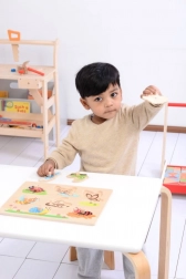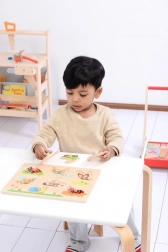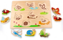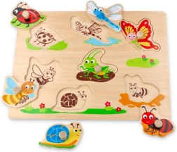 Ez a rovarmotívumú, fogantyúkkal ellátott fa beillesztős kirakó ideális didaktikai játék az első formák felfedezéséhez. A kényelmes gombos fogantyúk segítségével a gyerekek könnyen megtanulják az elemek kezelését, miközben fejlődik a finommotorikájuk és a kéz–szem koordinációjuk.