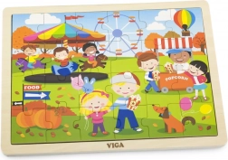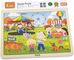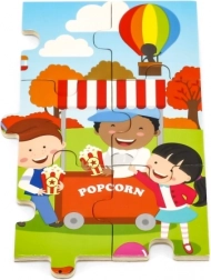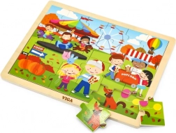 Fedezze fel a minőségi fa kirakót vidám, őszi vásári jelenettel. A 24 strapabíró elemmel és a kerettel a kisebbek is könnyedén kirakhatják, miközben játék közben természetesen gyakorolják a kéz–szem koordinációt, valamint az alak- és színfelismerést.