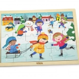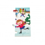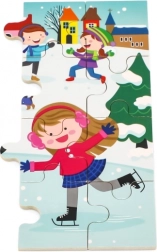 Színes téli jelenet, hóban játszó gyerekekkel, amely motivál az építésre, és fejleszti a színek, részletek és helyzetek észlelését.