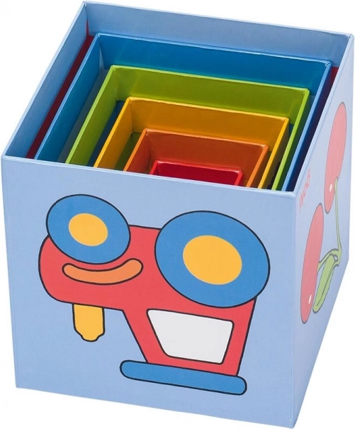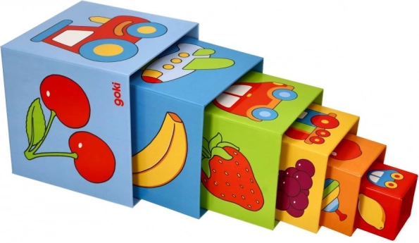 Építs színes, vidám tornyot! Ez a masszív, kartonból készült rakásolható torony a GOKI-tól gyümölcsök, közlekedési eszközök, játékok és állatok képeivel díszített. A legnagyobb kocka mérete 14,3 × 14,3 × 14,3 cm, az összeépített torony 57,5 cm magas. Ideális a finommotorika fejlesztéséhez, a színek és formák tanulásához, valamint a logika gyakorlásához. 12 hónapos kortól ajánlott.