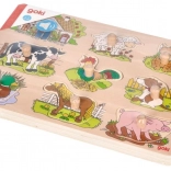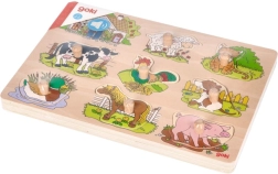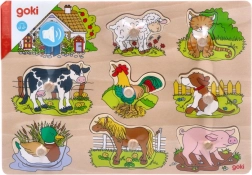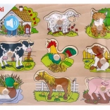 Ez a fa kirakó nyolc darabot tartalmaz háziállatok képeivel, amelyek a helyes nyílásba illesztve jellegzetes hangot adnak ki. Minden darab fa fogantyúval rendelkezik, ami megkönnyíti a kezelést és a biztonságos elhelyezést az alaplapon. A fa alaplap pontos kivágásai segítik a gyerekeket, hogy a darabokat a megfelelő helyekre helyezzék.