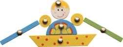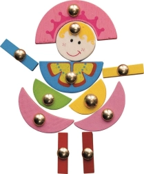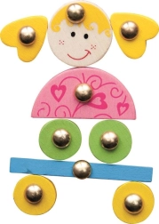 A színes fa elemek fém rögzítőkkel könnyen megfoghatók, fejlesztik a finommotorikát, edzik a szem–kéz koordinációt, és segítenek a színek és formák megismerésében.