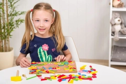 A parafa kalapálós mozaik ideális választás 5 éves kortól. A színes fa formák fém rögzítőkkel könnyen tarthatók és kis szegecsekkel rögzíthetők a parafa táblához, így a gyerekek figurákat, járműveket vagy teljes történeteket állíthatnak össze. A játék fejleszti a kreativitást és ösztönzi a fantáziát, miközben logikára és tervezésre tanít.