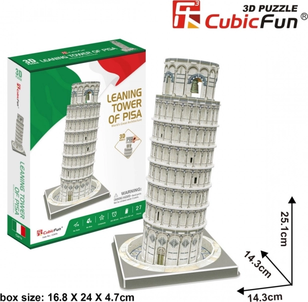 Ezzel a 3D puzzle készlettel saját másolatot készíthet a világhírű Pisai ferdetoronyból. A készlet 27 darabot tartalmaz, amelyeket speciális, habszerű anyagból gyártottak. A darabok számozva vannak, előre kivágottak a lapokon, és könnyen eltávolíthatók és összeszerelhetők a mellékelt útmutató alapján. Az összeszerelés nem igényel ragasztót vagy speciális eszközöket, ami azt jelenti, hogy a kezdők is élvezni fogják ezt a projektet. Összeállítás után az építmény méretei 14,3 x 14,3 x 25 cm.