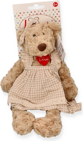 Lumpinka plüss mackó kockás ruhában. Puha, 0+ kortól biztonságos, ideális ölelgetéshez és dekorációnak. Kézi mosás 30 °C-on, kb. 43 × 25 cm.