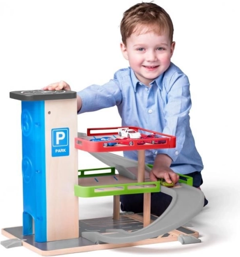 Ez a garázs több szintet kínál parkoláshoz és játékhoz, ami lehetővé teszi a gyerekek számára, hogy fejlesszék képzelőerejüket és ügyességüket.
