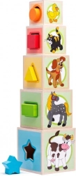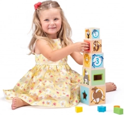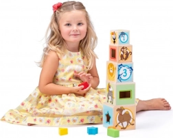 A fa torony poharakkal és forma-szelektálóval ötvözi a magasba építést a megfelelő formák megfelelő nyílásokba illesztésének gyakorlásával. A gyerekek fejlesztik szem–kéz koordinációjukat, tanulják a színeket, számokat és állatokat, miközben rengeteg kreatív játékélményben van részük.
