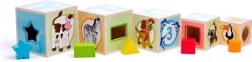 Gondosan megmunkált, simán lakkozott fa elemei kellemes tapintásúak és tartósak. A tornyot lehet építeni, a kockákat egymásba illeszteni és a formákat válogatni – mindez egy okos, fejlesztő játékban az óvodások számára.