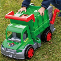 Nagy kukásautó gyerekeknek valódi funkciókkal: 60 cm hosszú, legfeljebb 50 kg teherbírással, működő emelővel a konténerekhez és nyitható hátsó ajtóval. A csomagban levehető konténer található, elöl vonószem a húzáshoz és felül fogantyú a kényelmes tartáshoz. Tartós, nem mérgező műanyagból készült, ideális kültérre és beltérre.